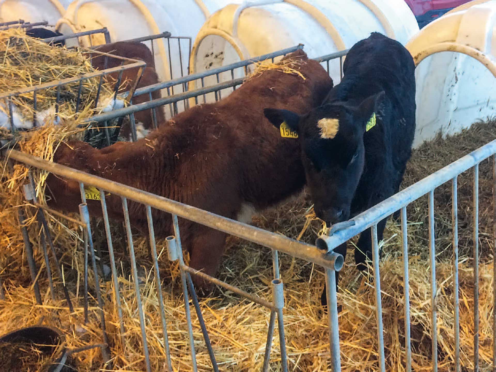 Kalvene er oppstallet to og to, som er bra for sosialisering. Mye strø er spesielt viktig ved uteoppstalling.