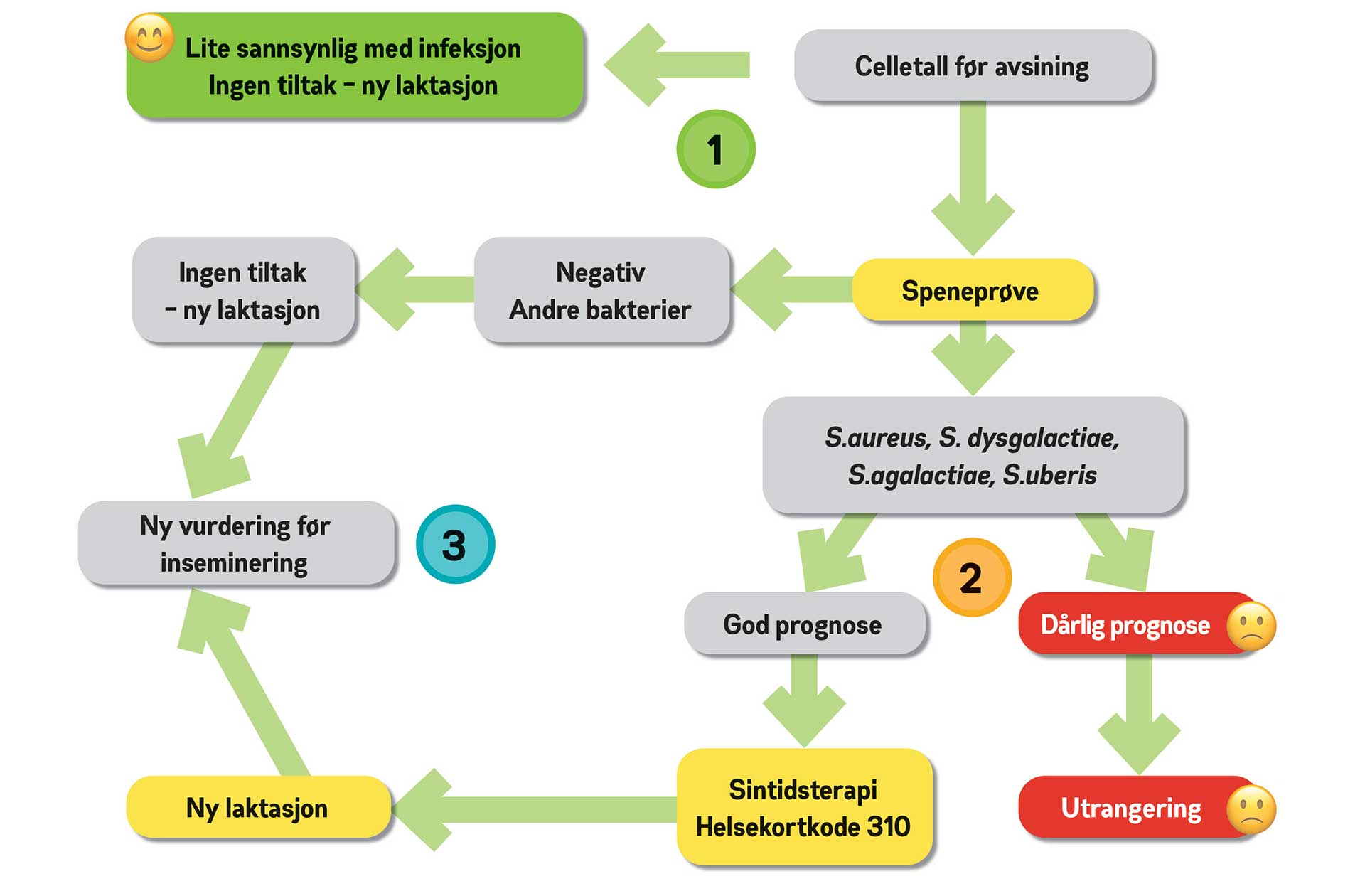 Det går gjerne ca. fire måneder fra avsining til inseminering, og mye kan ha skjedd. Se på informasjon om celletall og behandlinger i tidsrommet og vurder om kua bør utrangeres eller er god for en laktasjon til.