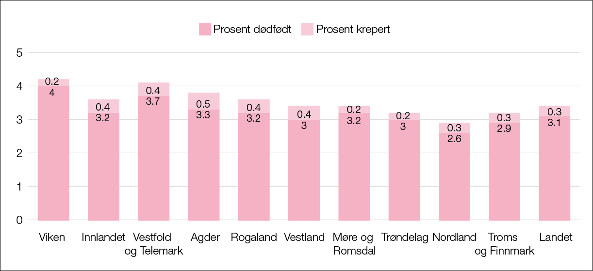 I figur 2 og 3 ser ein fordeling på kjønn og fylke for 2023 når det gjeld tidleg kalvedød og er delt inn i daufødte og kreperte kalvar. Det er noko spredning på fylkesnivå og det skulle vera muleg å redusere andel daufødte og kreperte kalvar i enkelte deler av landet.