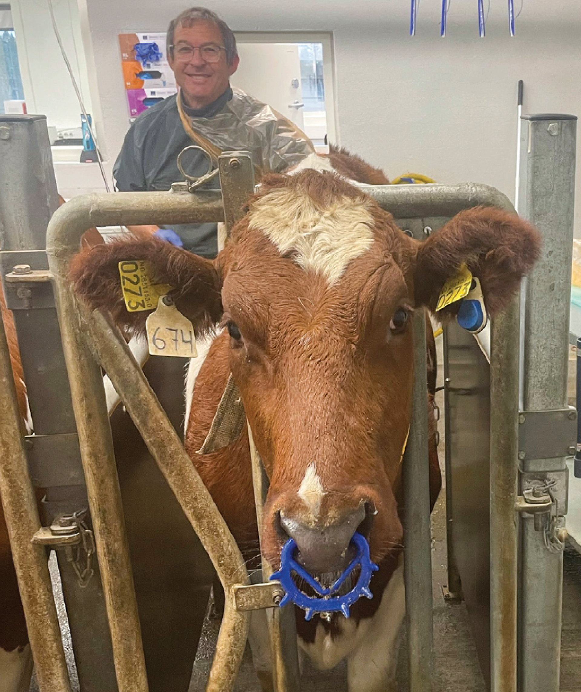 Når kvigene er omkring 10 måneder gamle, brukes en annen teknikk, MOET, multiple ovulation embryo transfer. Kviga behandles slik at mange egg modnes samtidig, og den insemineres på vanlig måte. Embryoene skylles ut før de har rukket å feste seg i livmoren. Kviga du ser her, kommer fra gården til Randi Iren Liverud i Indre Østfold. Den har 43 i avlsverdi og ligger langt over snittet på melk, jur, bein og jurhelse og har genetikk som vil bidra til lette kalvinger. Avlsforskerne har bestemt at den er en supermatch for 12391 Laupen- PP, og mannskapet på embryolaben er klare! Kviga skylles, væsken siles, og en skarpsynt gjeng sitter og leter etter embryo i mikroskopet. Hvert eneste lille embryo plukkes opp med en pipette, vaskes reint og kvalitetsvurderes. Embryo i riktig utviklingsstadium selekteres ut, fryses ned og sendes raskt ut til embryoveterinærene som legger dem inn i avtalebesetninger, og nå er det flere Laupen-kalver på vei etter blant annet kviga fra Indre Østfold!