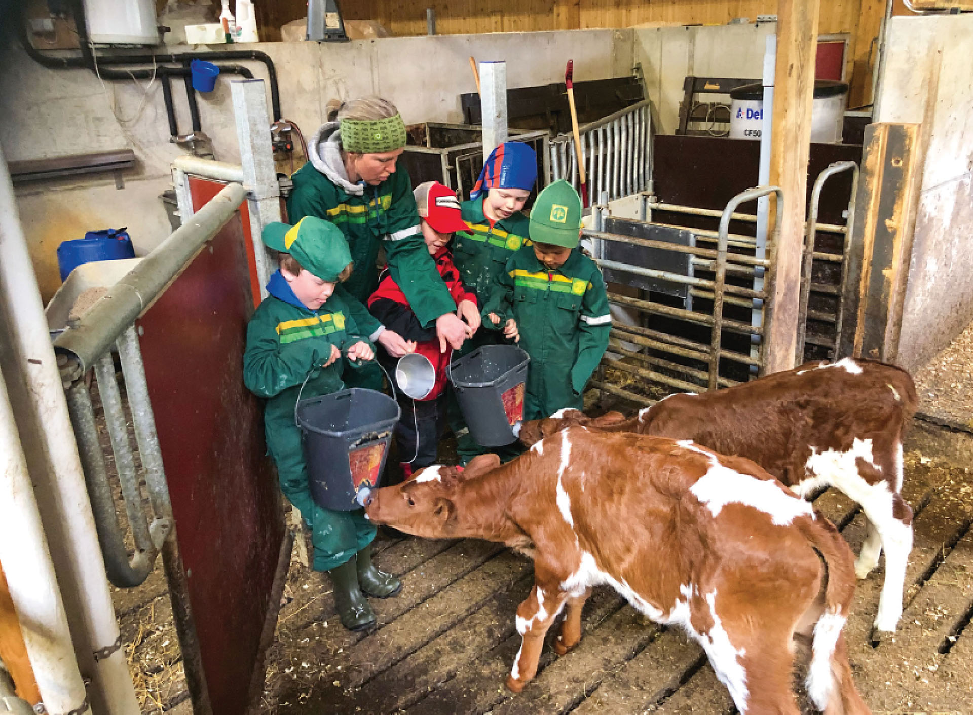 Dei yngste kalvane er godt skjerma for trekk i denne avdelinga like i nærleiken av kalvekjøkkenet. Kalvane vert fôra på mjølkeerstatning fram til dei er rundt to månader gamle. Her er stadig ungar på besøk, og her har Magnus og Sondre med seg kameratane Oddvar og Julian på kalvefôring.