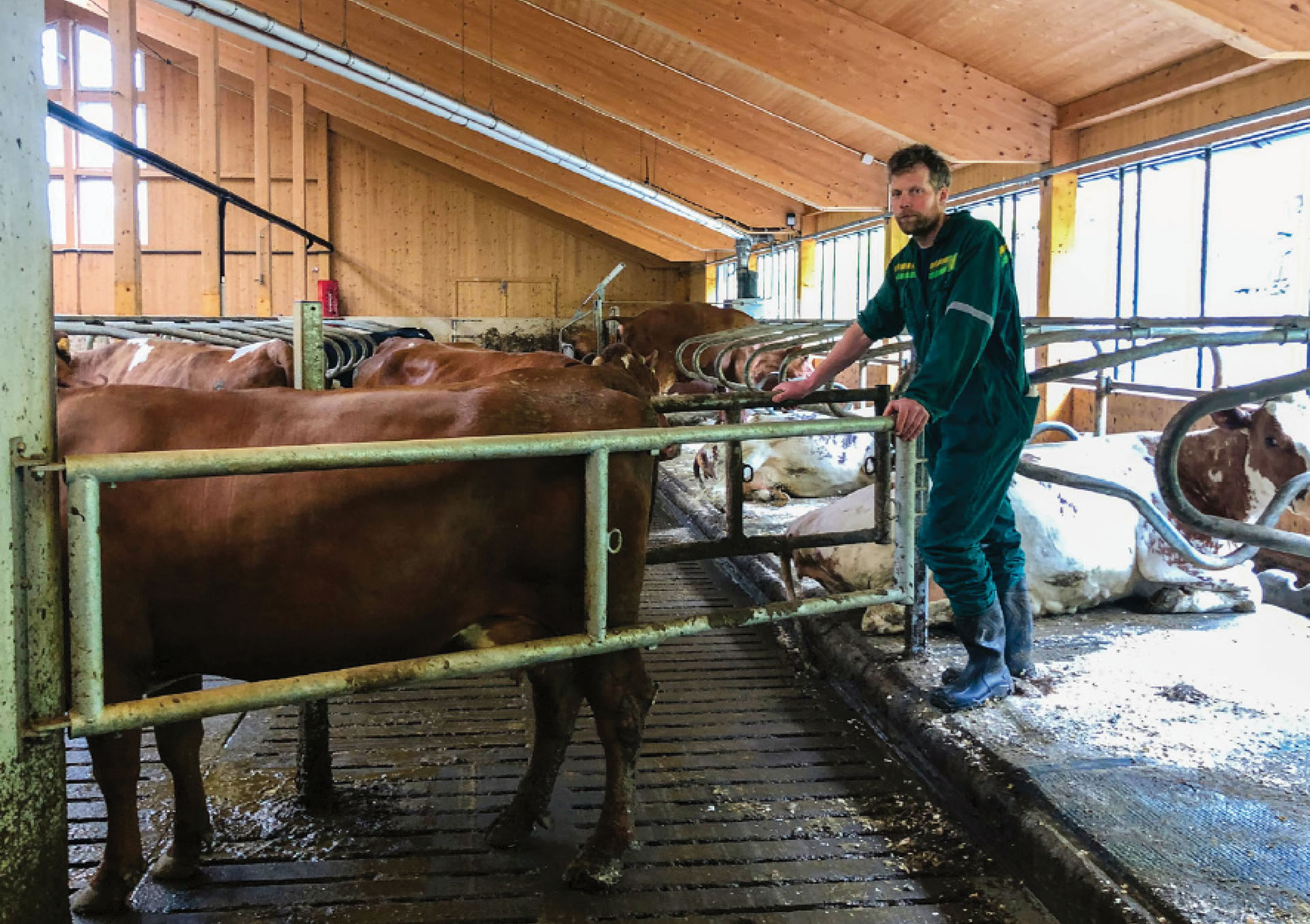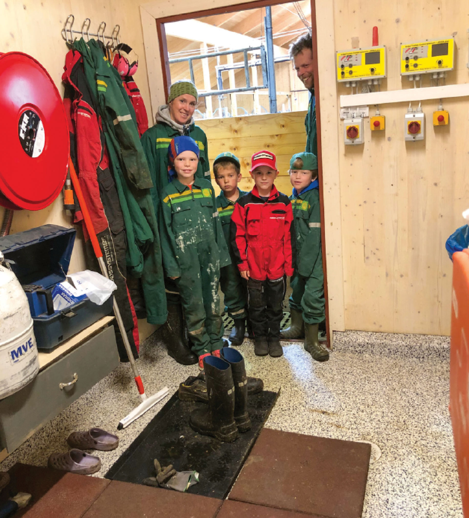 Før ein går inn i husdyrrommet, tek ein på seg fjøsstøvlar og kjeledress. I slusa er det også toalett, noko som er veldig praktisk, særleg når ein har små ungar som ofte er med i fjøsen.