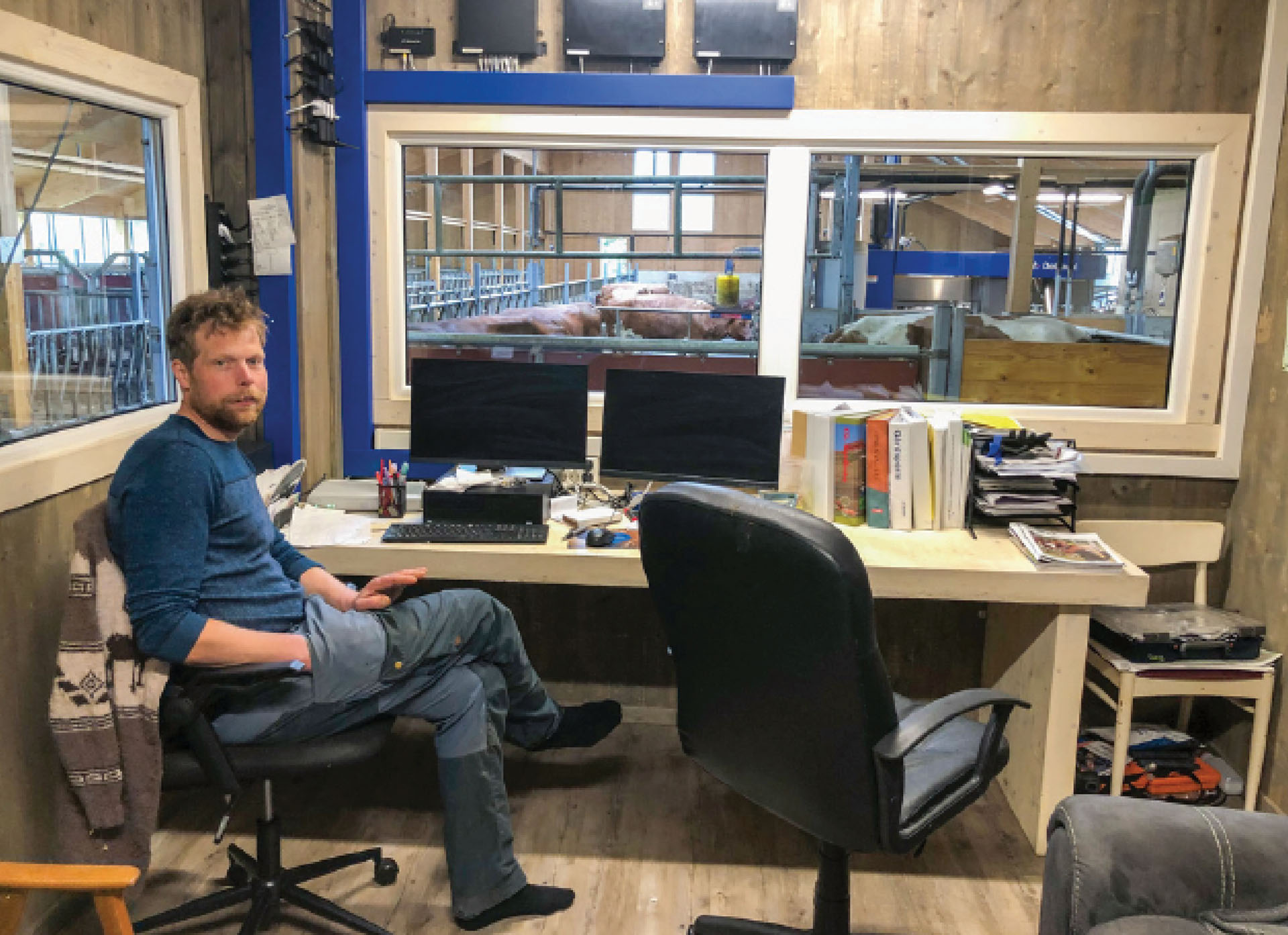 Frå fjøskontoret er det god utsikt til kalvingsbingane og elles i fjøsen. Det solide skrivebordet er laga av heiltrelaminat som er skore ut frå veggane under bygginga av fjøsen.
