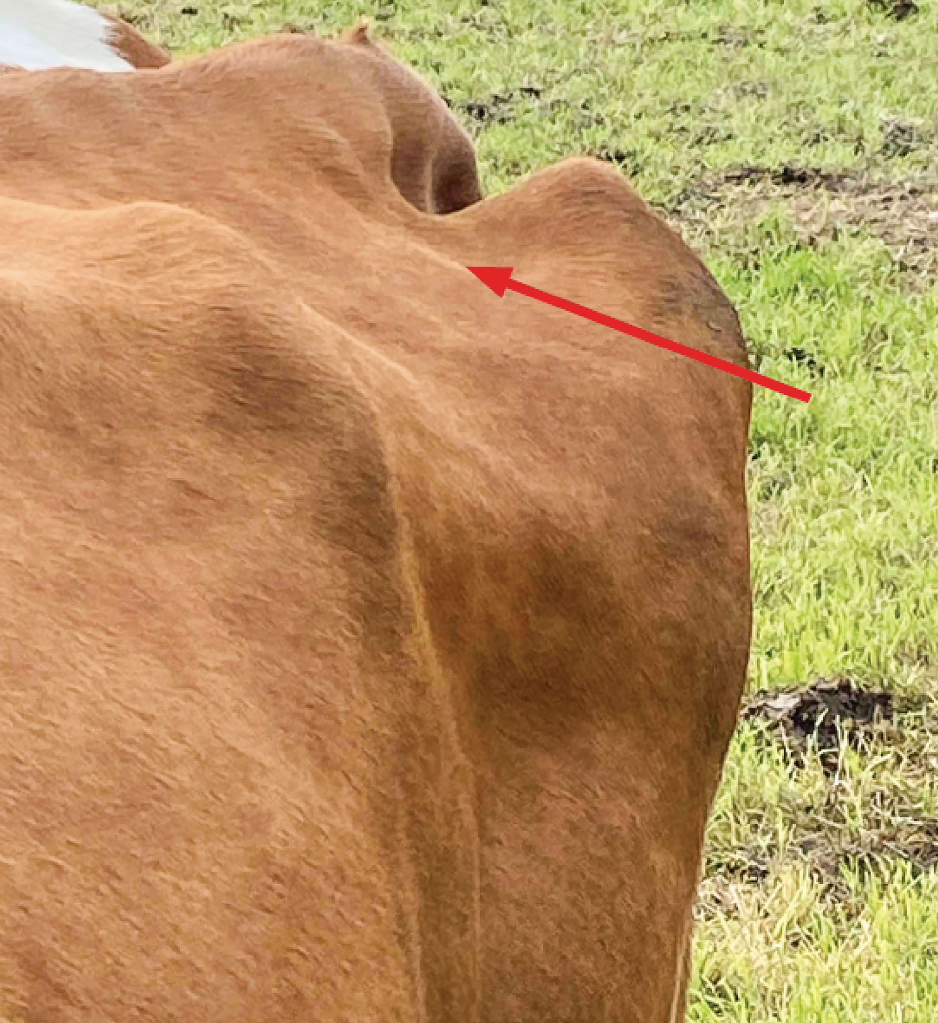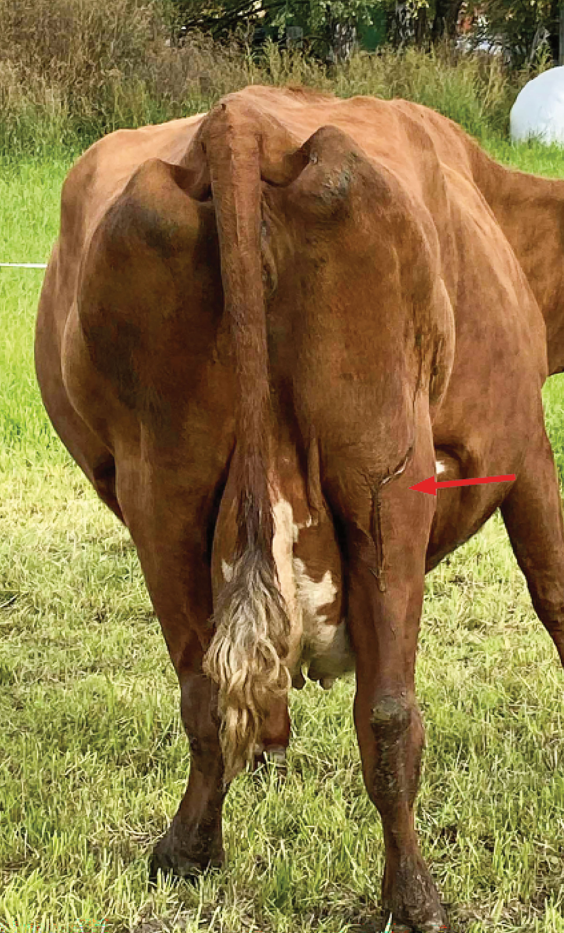 Noko «tynn ku» som kalva ca. 12 timar etter fotografering. Ikkje så fylt jur og spenar, men heilt nedslept kalvingssene. Pil syner tjukt slim.