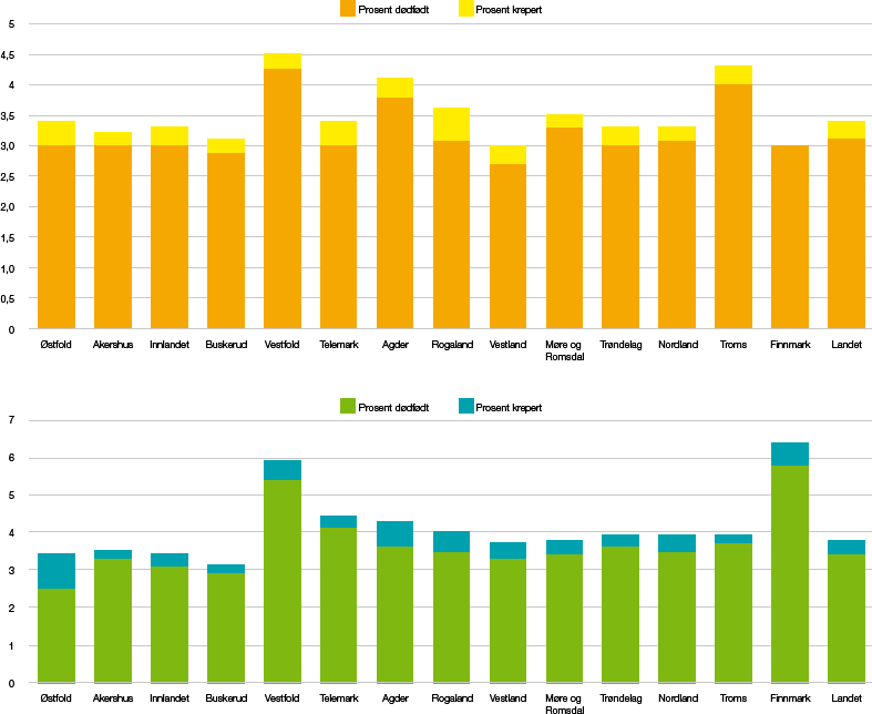 Figur 1. Frå Kukontrollen 2024: Oversikt over tidleg kalvedød (dødfødsel og kreperte innan ca. 1 månads alder fordelt på kjønn og fylke). Kvigekalvar (øvre del) og oksekalvar (nedre del).