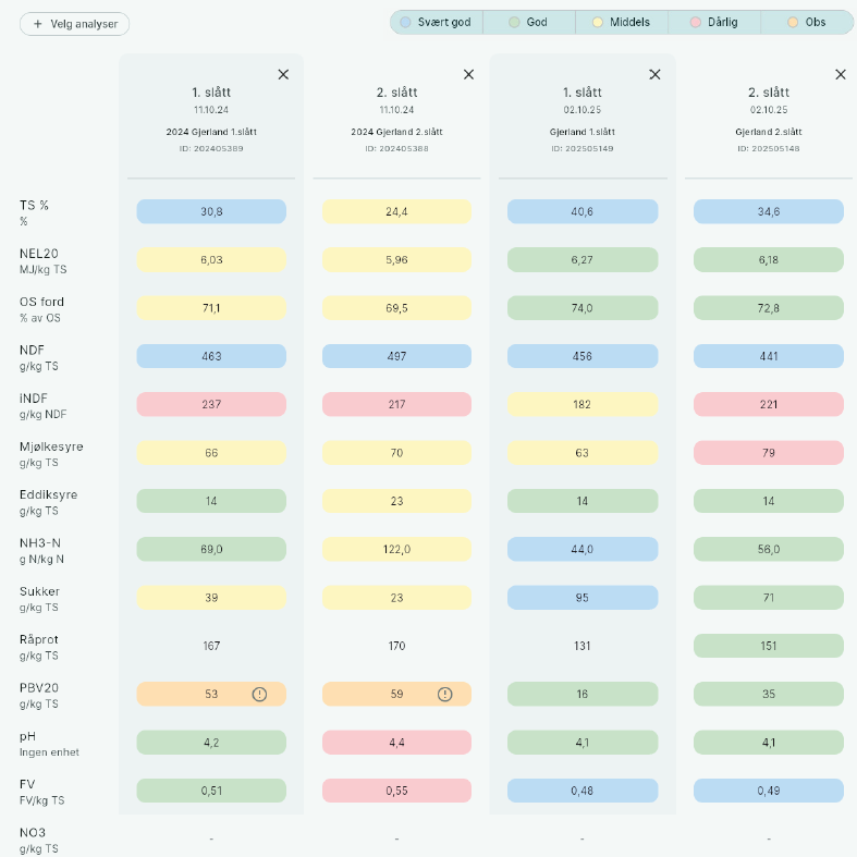 Når en sammenligner årets fôrprøver med fjorårssesongen ser en store forskjeller. Se evaluering av fôrprøvene i figur 1.