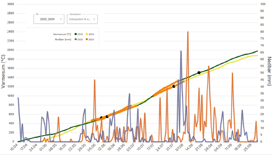 Figur 2: Diagrammet er hentet fra Eana skifte- legg merke til høstedatoer, varmesum og nedbørsmengde. Det er krevende høsteforhold.