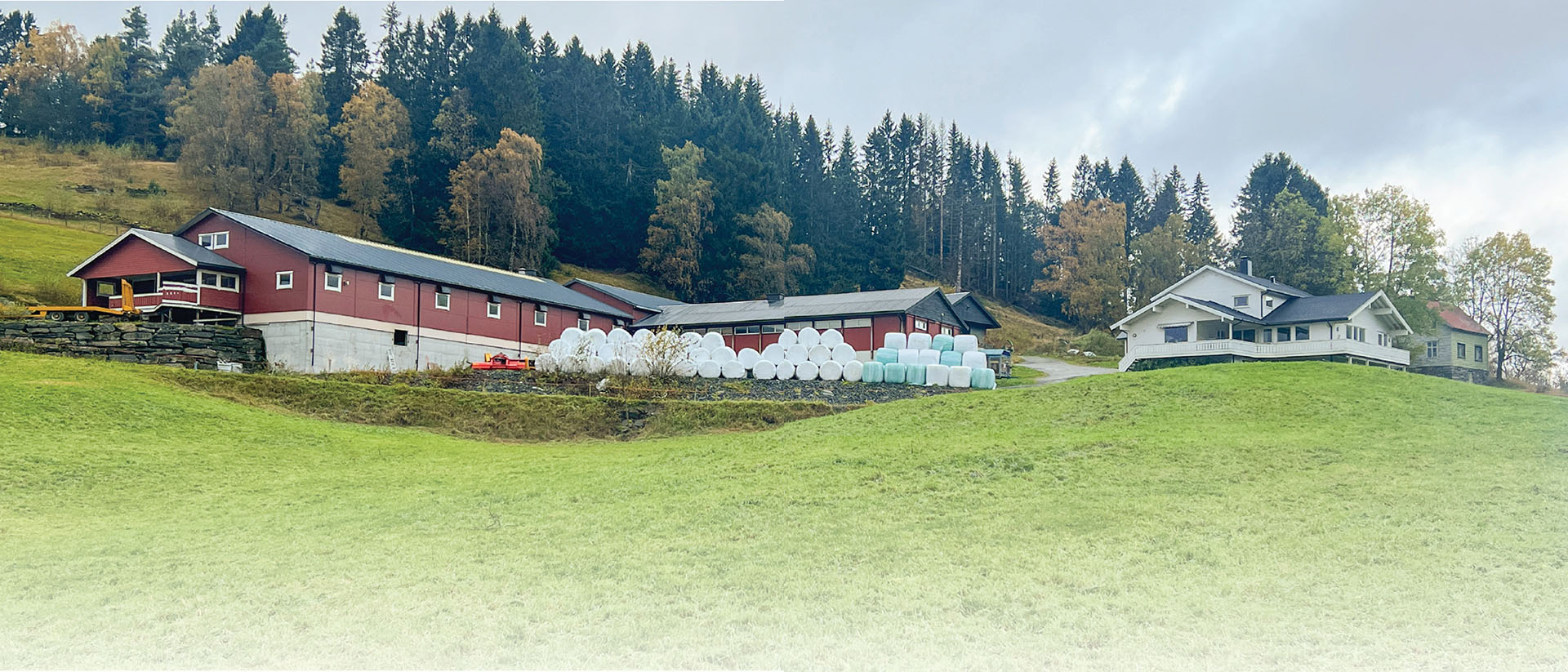 Det nye fjøset ble tatt i bruk i 2014. Det er bygd i vinkel på gamlefjøset bygd i 2014 (delvis skjult bak rundballene). Det ombygde gamlefjøset huser småkalver og kviger. Legg merke til en fin overbygd veranda ved inngangspartiet i enden av fjøset.