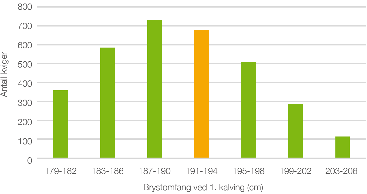 Alle kviger med brystomfang registrert de siste 20 dagene før første kalving for årene 1999–2020 inngår i datasettet. I alt 3 384 dyr oppfylte kravene. Dyra ble gruppert etter størrelse (figur 1), og snittalderen i gruppa er vist i figur 2. Ekstremvarianter ble ekskludert fra datasettet (<179 cm eller >206 cm). Gruppa med kviger som målte fra 187–190 cm kort tid før første kalving var størst, tett etterfulgt av dyr med 191–194 cm som brystmål. Sistnevnte intervall var Tines anbefalte mål på det tidspunktet analysen ble kjørt, og denne gruppa er markert med gul søyle i figurene. Brystmål på 191–194 cm tilsvarer en vekt på ca. 560–590 kg. Bortimot halvparten (49 prosent) av kvigene i datasettet var mindre enn de anbefalte 191 cm før første kalving, og 15 prosent var over 199 cm. Andelen små og store dyr har vært ganske jevn gjennom hele registreringsperioden.