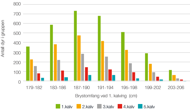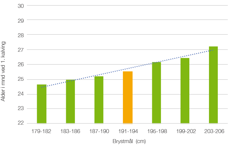 Det var ingen overraskelse at snittalderen i hver gruppe økte i takt med et større brystmål ved første kalving. Aldersvariasjonen innen hver gruppe var imidlertid stor, og gjenspeiler et svært ulikt dyrestell fjøsene imellom. Fôrstyrken/ tilveksten gjennom oppdrettet har stor betydning for dyras størrelse ved 1. kalving, og valg av insemineringstidspunkt og drektighetsresultat påvirker alderen ved kalving. I dette datasettet var kviger med brystmål mellom 191–194 cm i snitt 25,5 (+/- 2,1) måneder gamle ved første kalving.