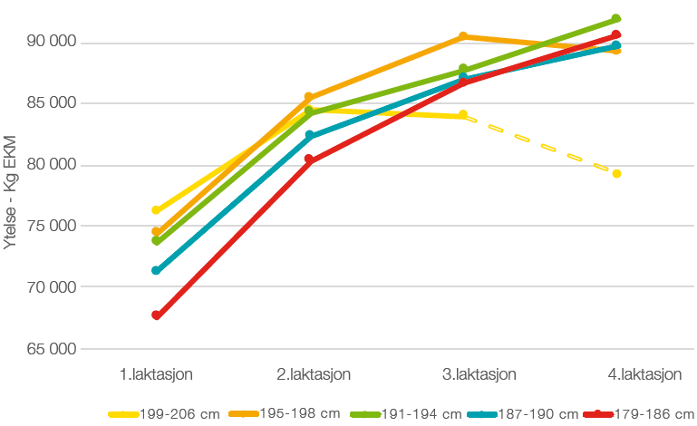 Dyregruppen med størst brystomfang melket statistisk mest i første laktasjon, men ytelsesutviklingen “stagnerte” når dyra ble eldre. Denne gruppen hadde ellers svært få dyr representert i 4.