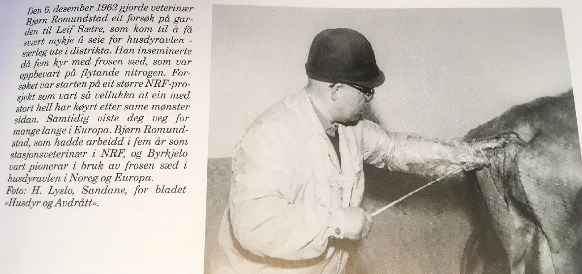 Den 6. desember 1962 gjorde veterinær Bjørn Romundstad eit forsøk på garden til Leif Sætre, som kom til å få svært mykje å seie for husdyravlen - særleg ute i distrikta. Han inseminerte då fem kyr med frosen sæd, som var oppbevart på flytande nitrogen. Forsøket var starten på eit større NRF-prosjekt som vart så vellukka at ein med stort hell har køyrt etter same mønster sidan. Samtidig viste deg veg for mange lange i Europa. Bjørn Romundstad, som hadde arbeidd i fem år som stasjonsveterinær i NRF, og Byrkjelo vart pionerar i bruk av frosen sæd i husdyravlen i Noreg og Europa.