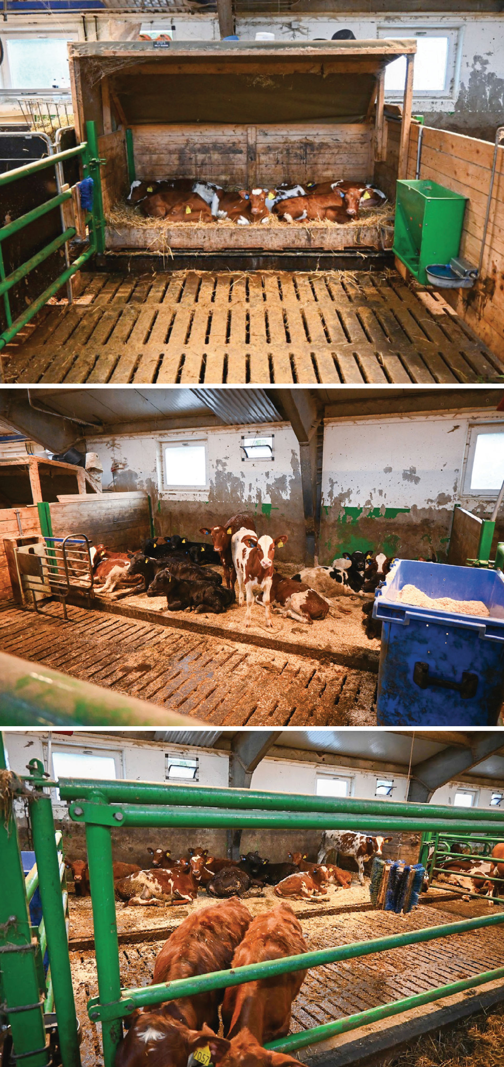 Det er fullt i kalvebingene hos Åker samdrift. Det burde bare vært ca. halvparten så mange dyr, synes Odd Arne. I denne bingen bruker de halm fra september til mai og flis om sommeren. Det reduserer fluemengden mye.