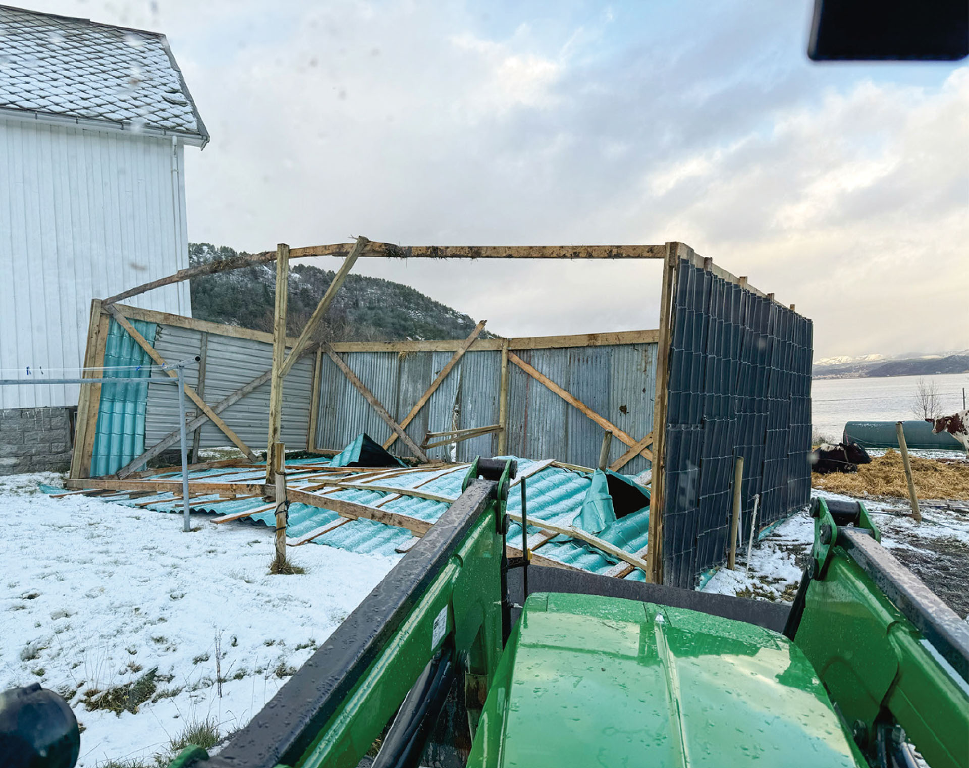 Det er ett under at jeg ikke falt ned mer enn jeg gjorde, da jeg er selvoppnevnt superklæbb. Med bronkitt/forkjølelse innabords, ble jo ikke balansen bedre, og plusser du på en typisk trøndersk høst med mye regn oppå der igjen, da er det ett lite mirakel. Men skuret sto til slutt. 50 kvadratmeter (de må jo leve i litt luksus når de skal melke). Laget på viljestyrke, Redbull og bannskap. Men det var ett fint syn da det sto ferdig. Dessverre varte det bare i noen dager, da det kom ett vindkast (som egentlig ikke var så sterkt) og tok med seg hele skuret. Som om det ikke var nok, var det midt i levering til skolebuss og barnehage, og jeg var så klart alene oppi det hele. Og min kjære uten telefon den dagen, så jeg hadde ingen å ringe for å spørre om råd. Leskuret måtte sikres, for det falt kun 1–2 meter unna huset, barna måtte kjøres, jekkestroppene lå selvfølgelig ikke der de skulle og hodet måtte holdes kaldt. Sett i ettertid, så er det et fantastisk plott til en komiserie. Som jeg titt og ofte føler livet mitt er, uten at jeg egentlig har signert kontrakt på det.