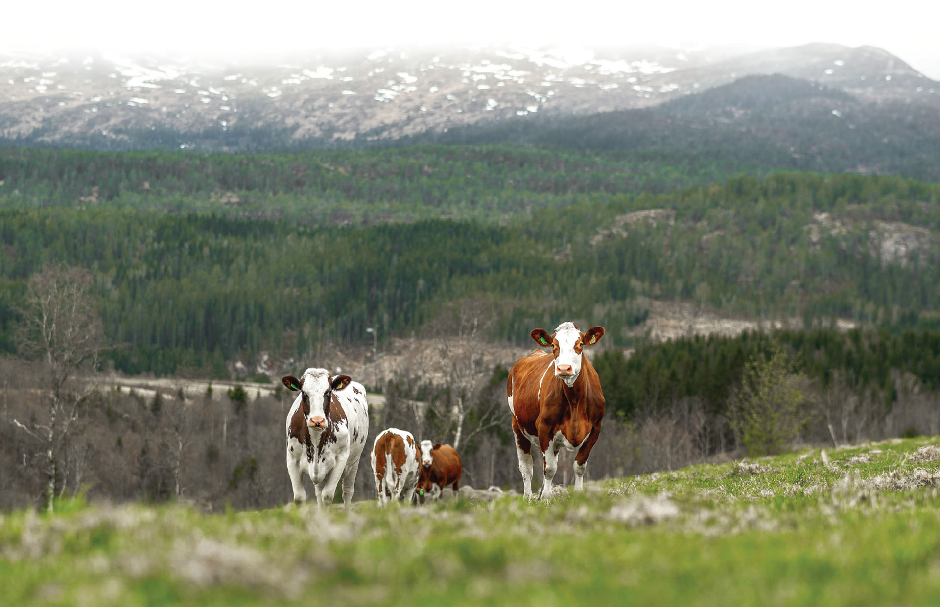 Bilde fra sinkubeite til Holstadsve gård på Namdalseid. I bakgrunnen ser man fjellet Storsnøheia. Til venstre NRF-kua Fagros og til høyre Mina (MelkesimmentalxNRF).