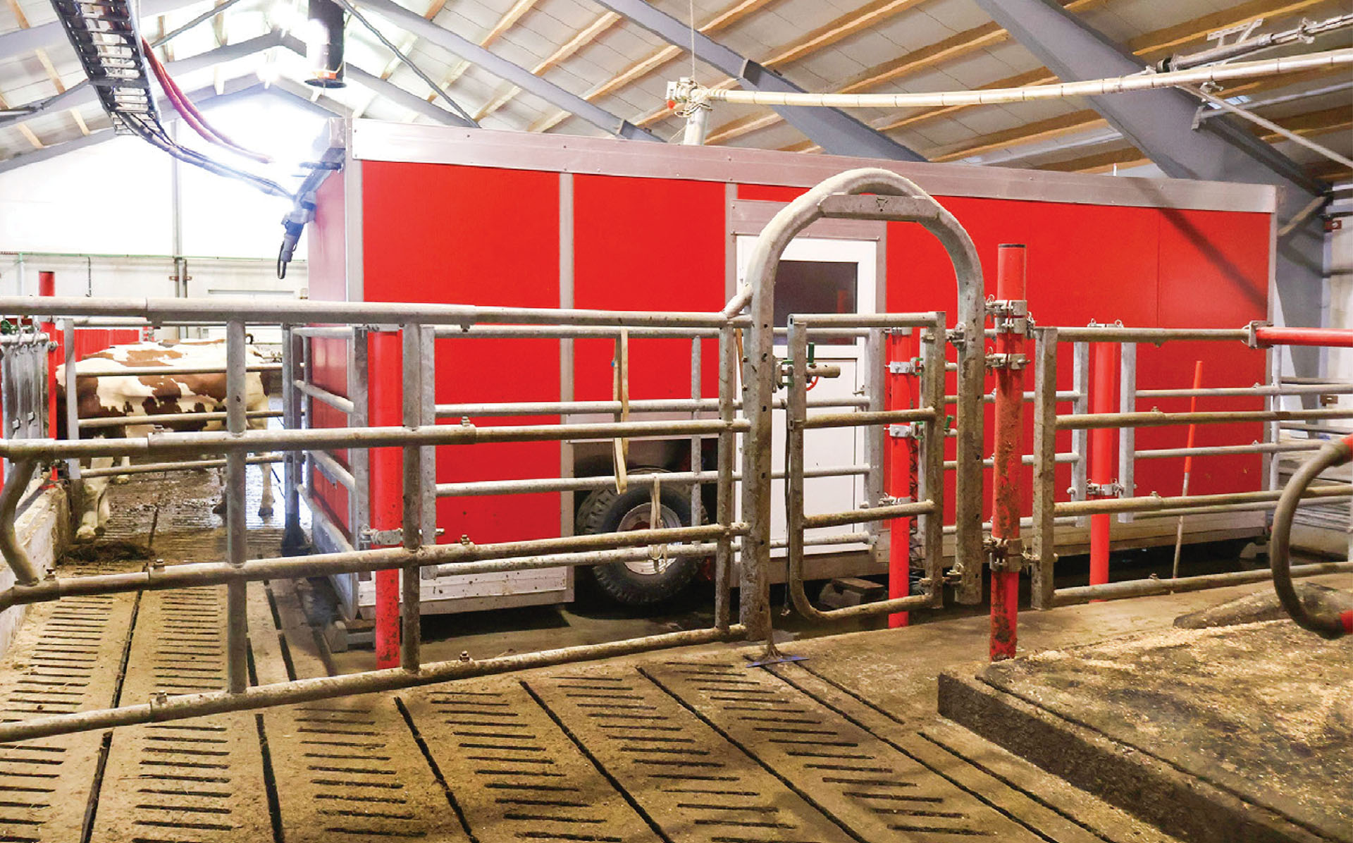 Melkeroboten står i en konteiner med hjul, og kan kjøres ut fra fjøset med traktor.