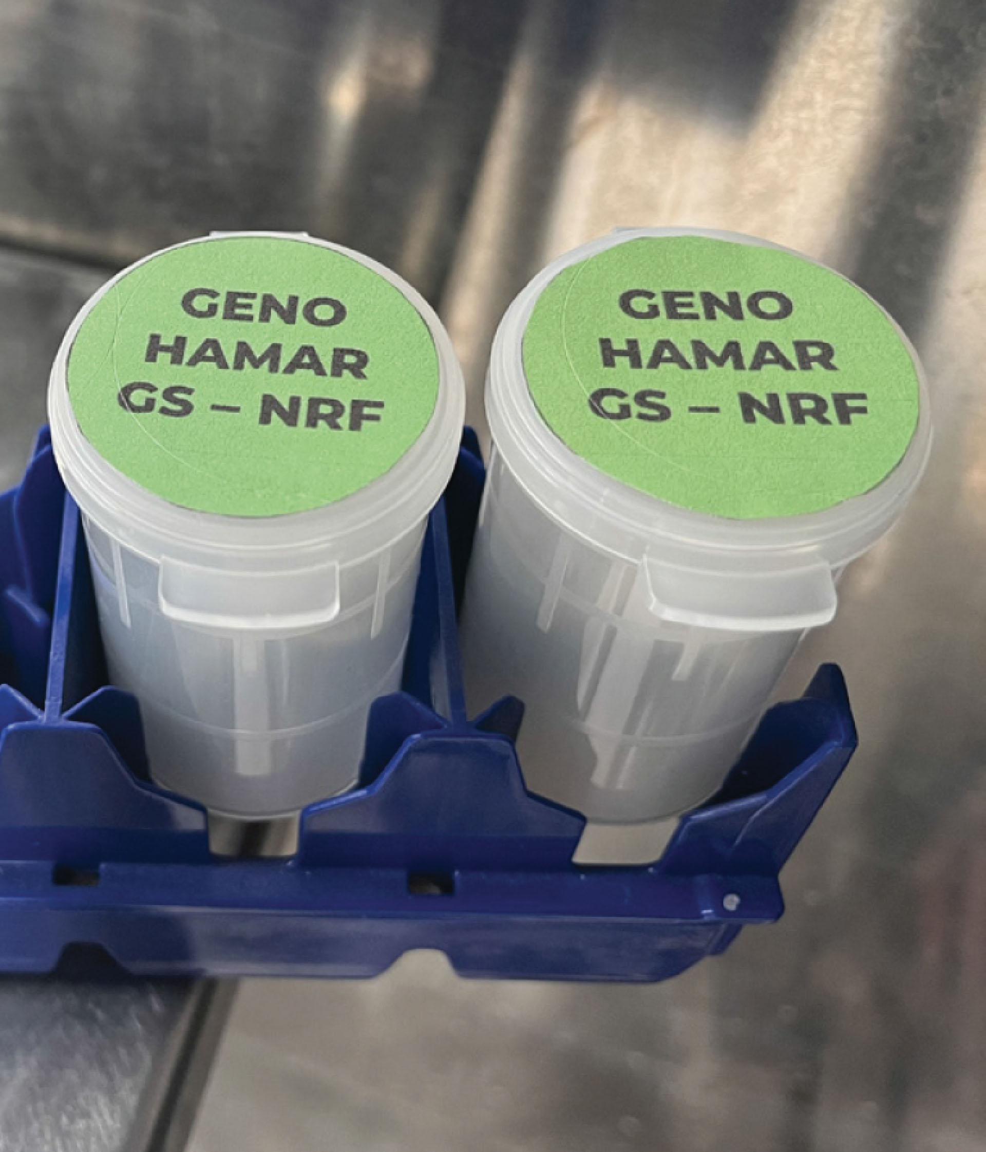 Husk å klistre på rund, grønn etikett på TOPPEN av lokket til prøvebegeret. Sett prøvebegeret i den blå skinna som også brukes til mjølkeprøver, for at mjølkebilsjåføren skal ta med seg GS-testen. Fyll resten av den blå skinna med tomme prøvebeger. Q-meieriprodusenter trenger ikke sette prøvebegeret i blå skinne for at mjølkebilsjåføren skal ta med GS-prøven.