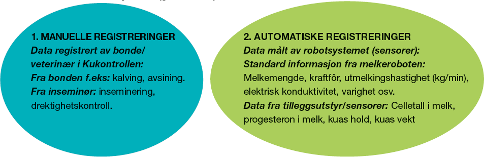 Figur 1. Viser inndeling av data som kommer fra melkeroboten. Dataene er delt i to ulike kategorier: data registrert manuelt av bonden eller innrapportert fra veterinær (blå sirkel) eller objektive målinger fra de automatiske sensorene i systemet (grønn sirkel).