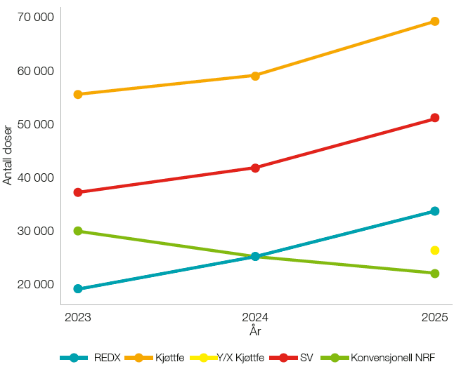 Figur. Utvikling i salg av ulike sædkategorier 2023–2025. Konvensjonell NRF (grønn kurve) må multipliseres med 10 for å få riktig antall. For kjønnsseparert kjøttfesæd (X/Y) har vi bare tall for 2025.