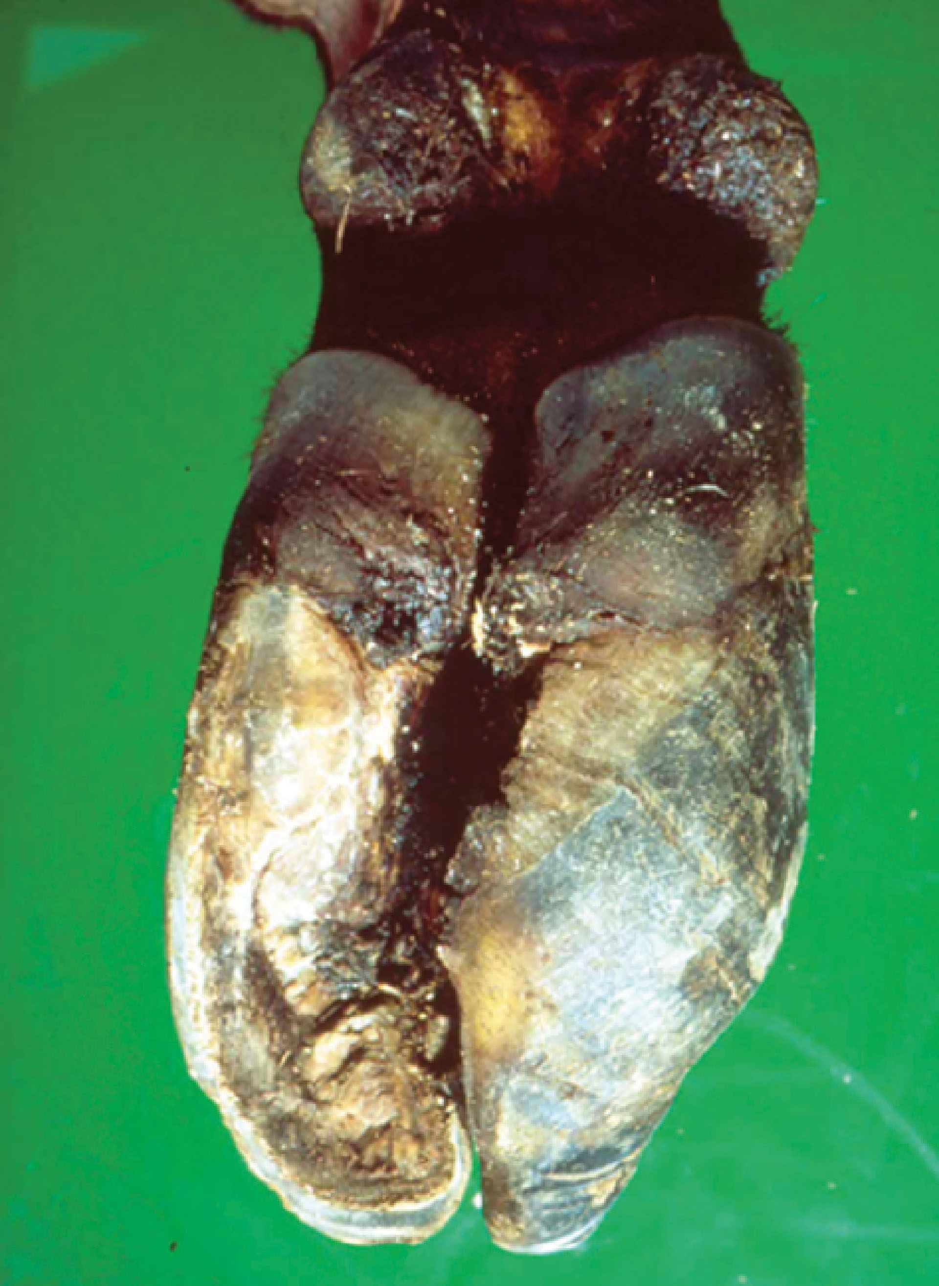 Korktrekkerklauv høyre bakbein. Den utvendige klauvveggen på ytterklauva har vokst under sålen.