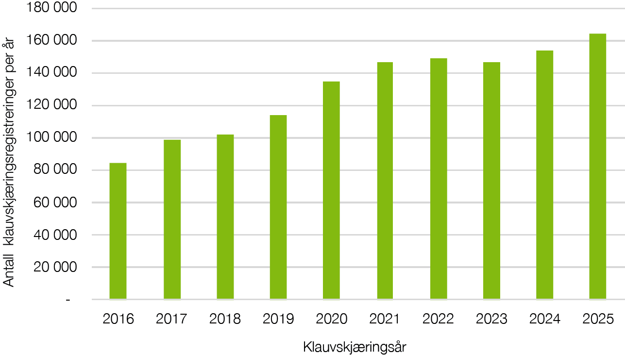 Figur 1. Utvikling i årlige klauvskjæringsregistreringer fra 2016 til og med 2025.