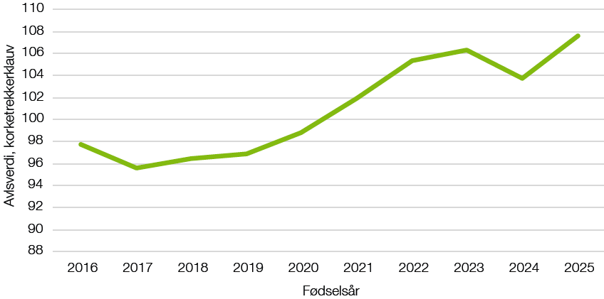 Den genetiske utviklingen for denne egenskapen er vist i figur 2. Det tar en generasjon fra innføring av nye egenskaper til man begynner å se framgang og dette forklarer den at framgangen ikke gjør seg gjeldende før 2019–2020. Kurva gjør en liten dipp ned i 2024. Dette kan vanskelig forklares med annet enn at eliteokseårgangen bak disse dyra tilfeldigvis var litt svakere for korketrekkerklauv.