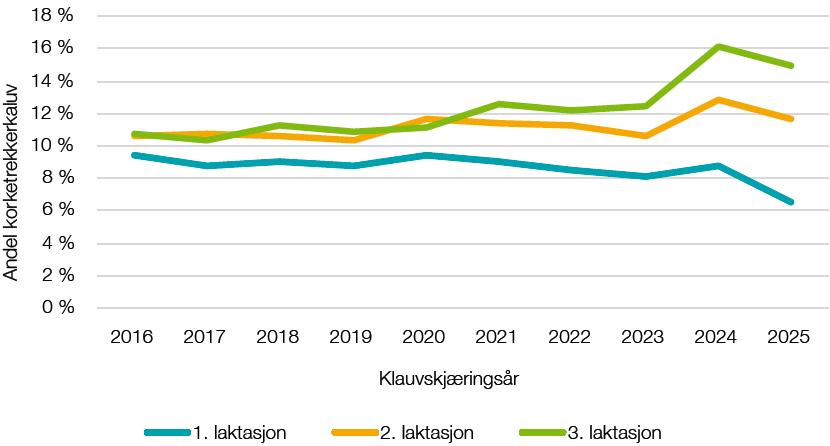 Den fenotypiske utviklinga er vist i figur 3. Vi ser en fin nedgang i korketrekkerklauv for første laktasjonskuer, og dette stemmer overens med den genetiske trenden. Det er derimot overraskende å se at utviklinga har vært ulik for de tre laktasjonsnumrene. For 2. laktasjon ser vi en ganske flat utvikling, mens vi for 3. laktasjon ser en økning i andel dyr med korketrekkerklauv. Vi veit at det er flest registreringer fra 1. laktasjon og at disse dermed vil dominere avlsverdien, Man kan spørre seg om korketrekkerklauv i de ulike laktasjonene bør betraktes som delvis ulike egenskaper med korrelasjoner vesentlig under 1,0.