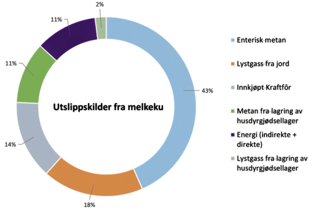 I figur 1 ses det at den største klimagassutslippskilden hos melkekyr er metan dannet i drøvtyggernes fordøyelsesprosess. Beregningene påvirkes av registreringer av innkjøpt kraftfôr, grovfôrkvalitet og registreringene i Kukontrollen/Eana. For å redusere metan fra dyras fordøyelsessystem kan bonden gjøre endringer i fôringa, forbedre grovfôrkvaliteten, justere forholdet mellom grovfôr og kraftfôr, og sikre at fôrrasjonen er tilpasset dyrenes produksjon.