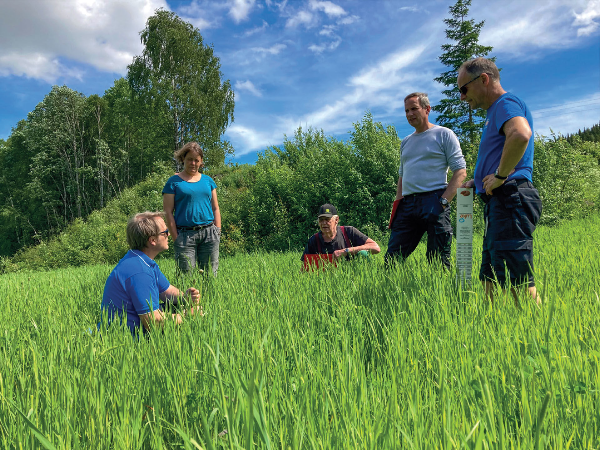 Et inspirasjonsbilde foran vekstsesongen -ta med deg rådgivere ut på jordet. Her ser vi Stein Jørgensen (NLR Innlandet) og Sverre Wedum (Tine Rådgiving) i ivrig diskusjon om høstetid sammen med produsentene Elisabeth Gjems, Thomas French og Knut Kristiansen. Bildet er tatt i månedsskiftet mai/juni.