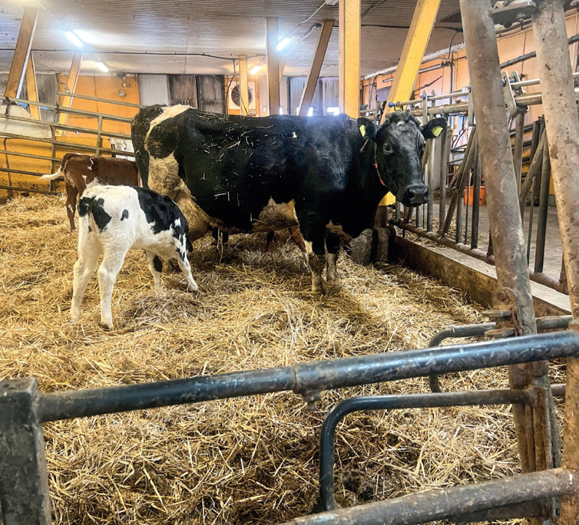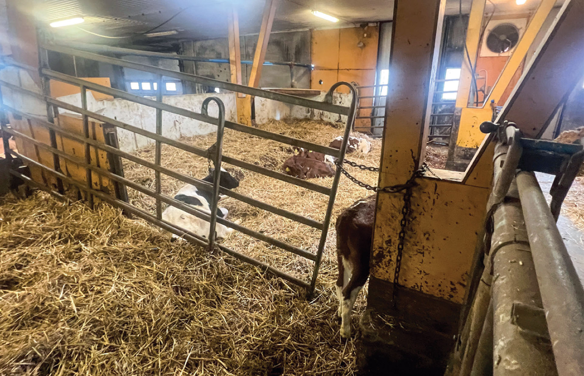 Det går mye halm i bingen der ku og kalv møtes. Der kan de ha opptil fem kyr som besøker kalvene sine samtidig. Bingen tømmes mellom hver pulje og vaskes om sommeren. Kua på bildet har fått sin niende kalv.