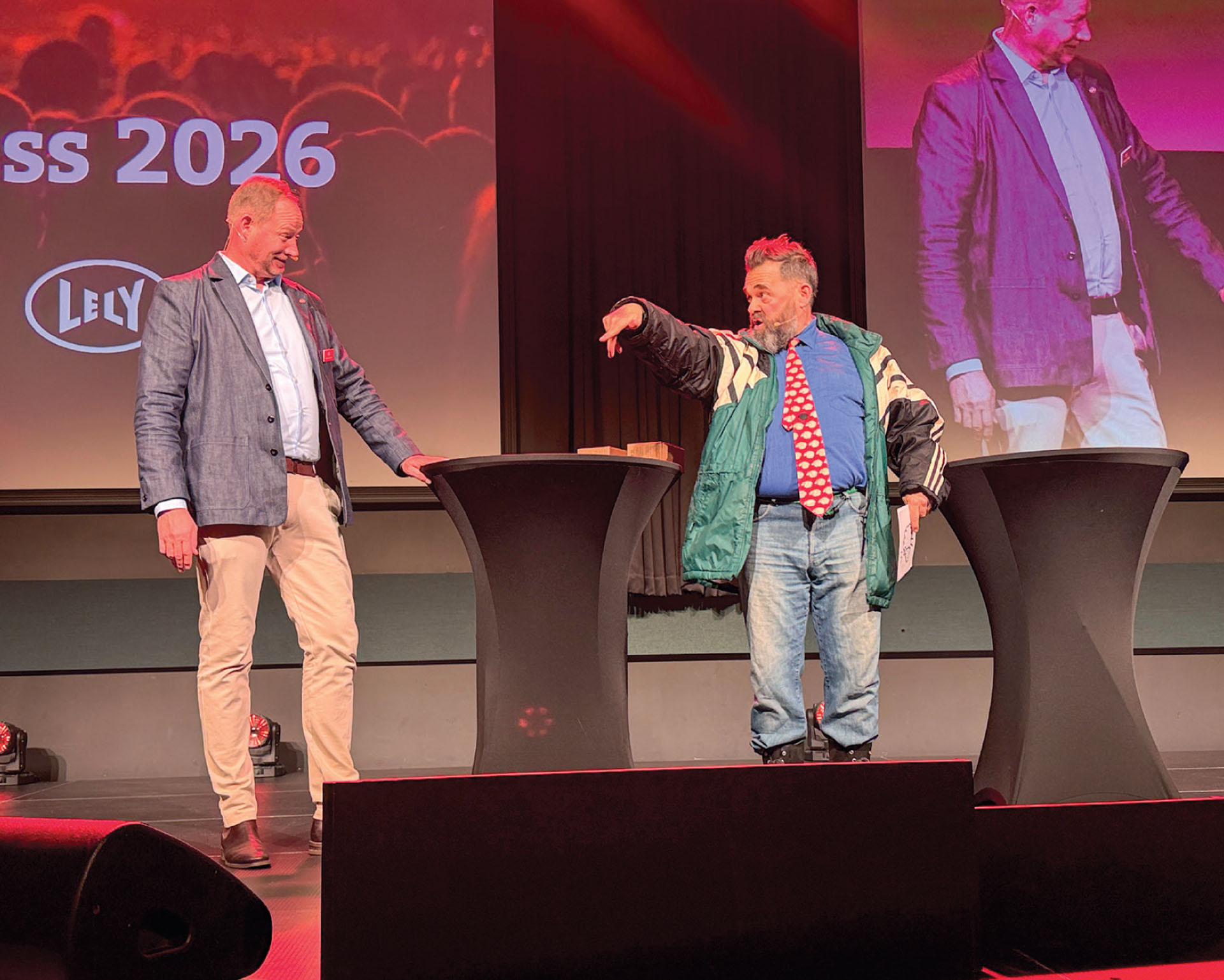 Konferansier Klaus Sonstad i karakter som den halvøkologiske sauebonden Odin Jensenius. Her i engasjert samtale med Norbert van Hemert fra Lely Industries.