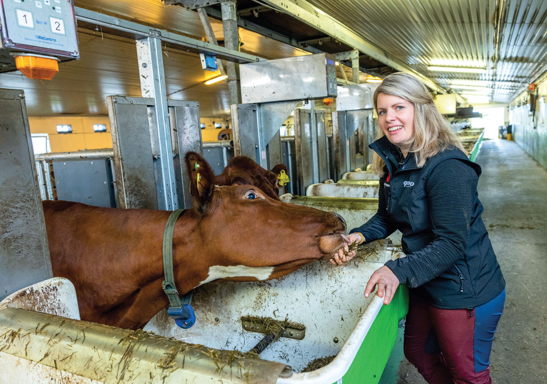 Avlsforsker i Geno Karoline Bakke sammen med ei av kuene på Kjos gård som er med på metan- og fôreffektivitetsprosjektet. Kjos gård er en av de fjorten gårdene der det blir gjort metanmålinger som skal gi grunnlag for en indeks for metanutslipp.