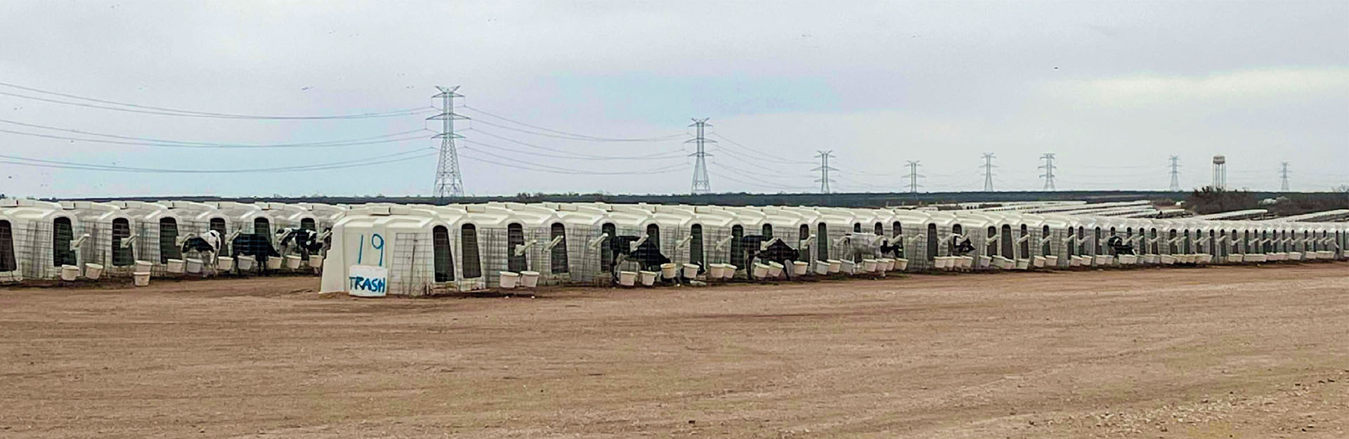 Kalvehytter så langt øyet kan se. Kalvene får tildelt melk og har tilgang på «kornblanding» og vann.