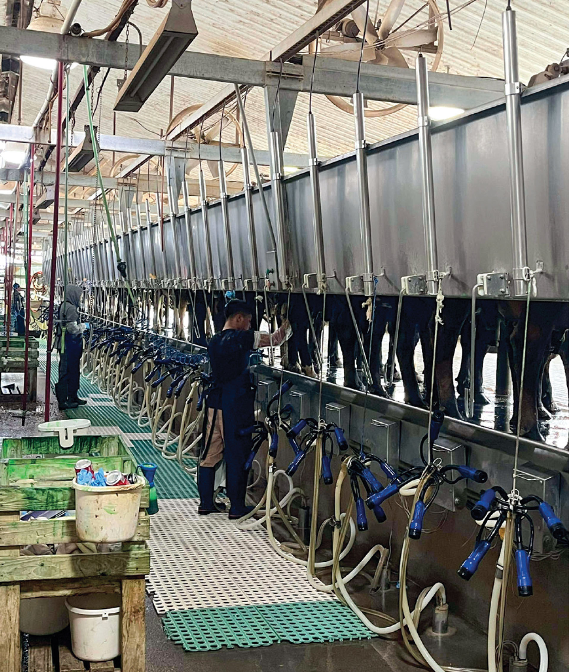 Josh kjenner godt fordelene med NRF, men stiller også noen klare krav for å lykkes med salget. Nummer én er melkeytelse, og der har han hatt flere gode okser opp gjennom. Dessuten, i et opplegg med manuell melking av lange rekker med kuer, er det viktig med konformitet – man kjører med en eller to okser på hele besetningen for å få minst mulig variasjon mellom individene. - Det handler om muskelminne, sier Josh til oss mens vi ser på budeiene som mjølker rekker med 40 kyr om gangen. Det går i full fart. Med besetninger på 2 000 mjølkekyr og mer, må opplegget være rasjonelt. I en slik besetning skjer vurderingene mindre på individnivå enn vi er vant til. Kontinuerlig mjølking gjennom døgnet med to halvtimes avbrudd for å vaske systemet – hvert dyr mjølkes tre ganger. Mannskapene går på skift.
